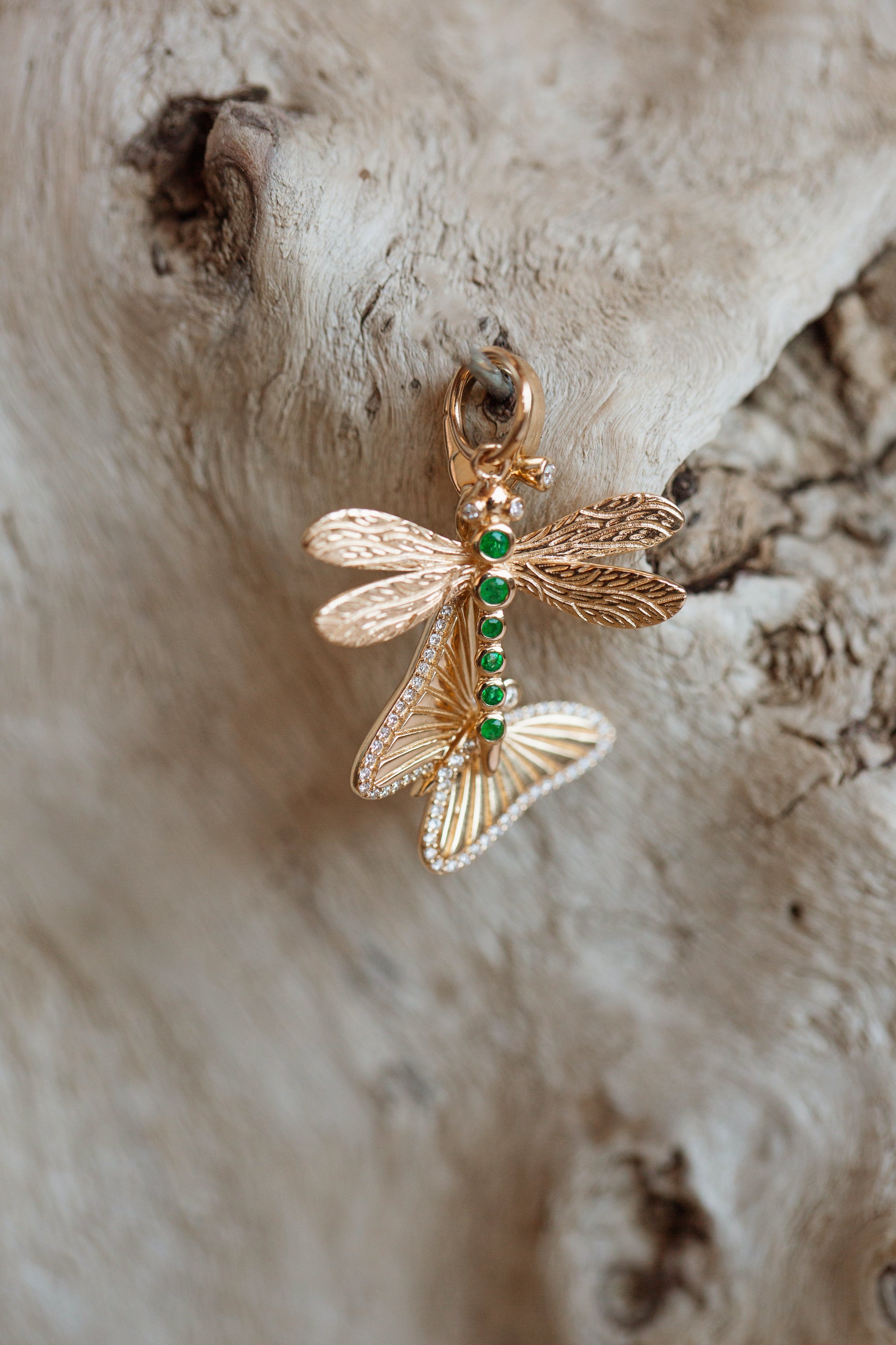Add a touch of whimsy to your style with our Ciara Textured Dragonfly Pendant. Made from 14 karat yellow gold with textured wings and a matte finish, it features sparkling emeralds along the center. A symbol for transformation, growth & living in the moment.