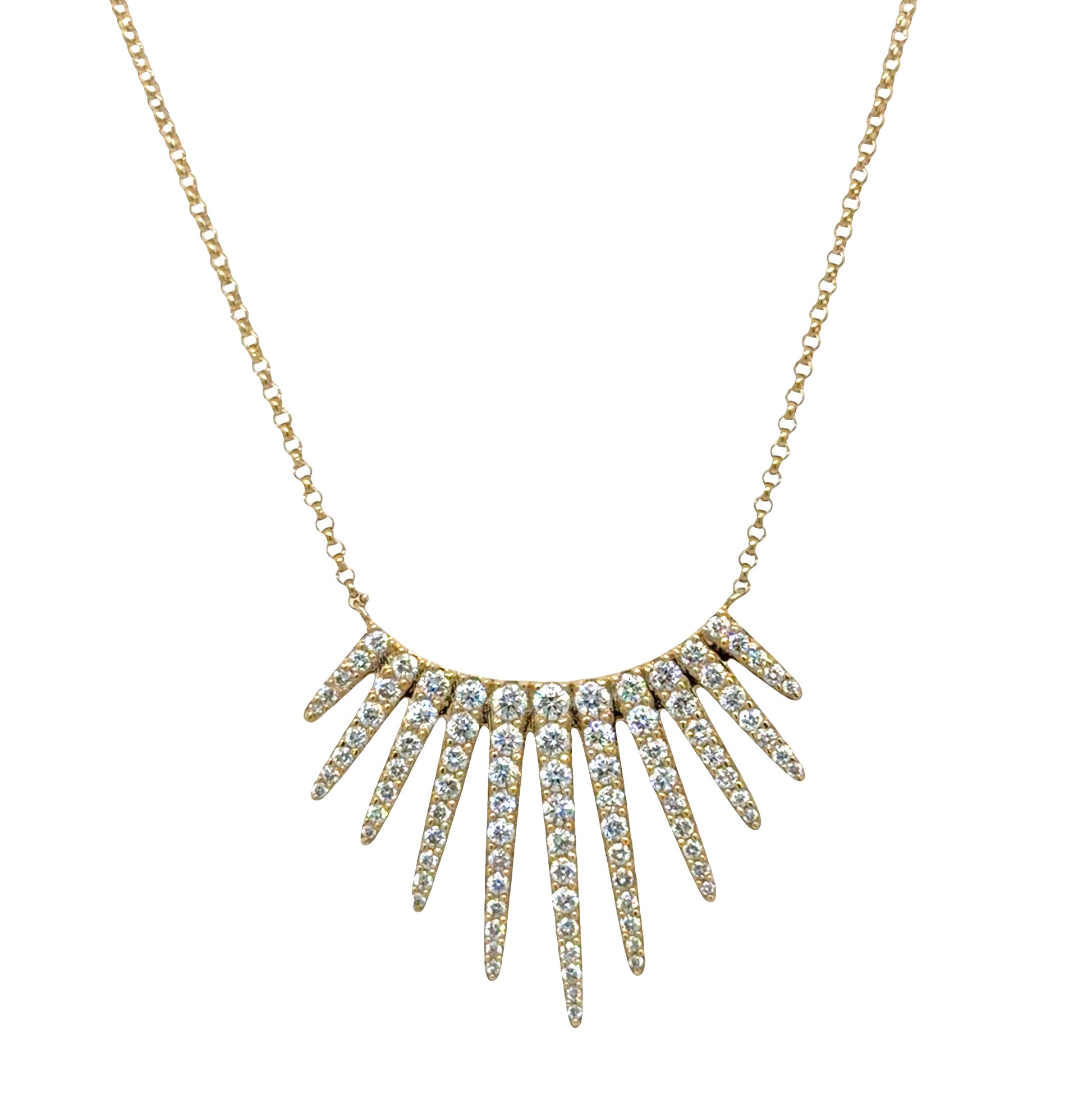 Bold yet refined, this 14k yellow gold diamond spear necklace features a fan of pavé-set diamond spears that radiate outward with striking brilliance. Symbolizing strength, protection, and forward momentum, the spear is designed as a modern talisman—meant to empower and inspire.