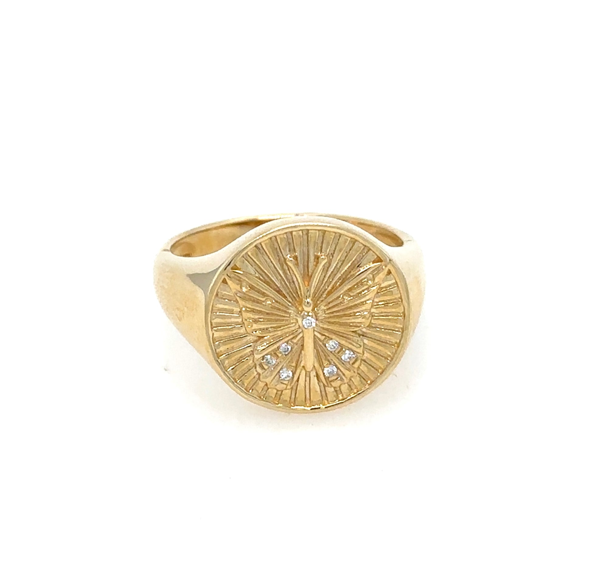 A beautiful coin ring adorned with a diamond butterfly. The butterfly is a symbol for transformation and new beginnings.