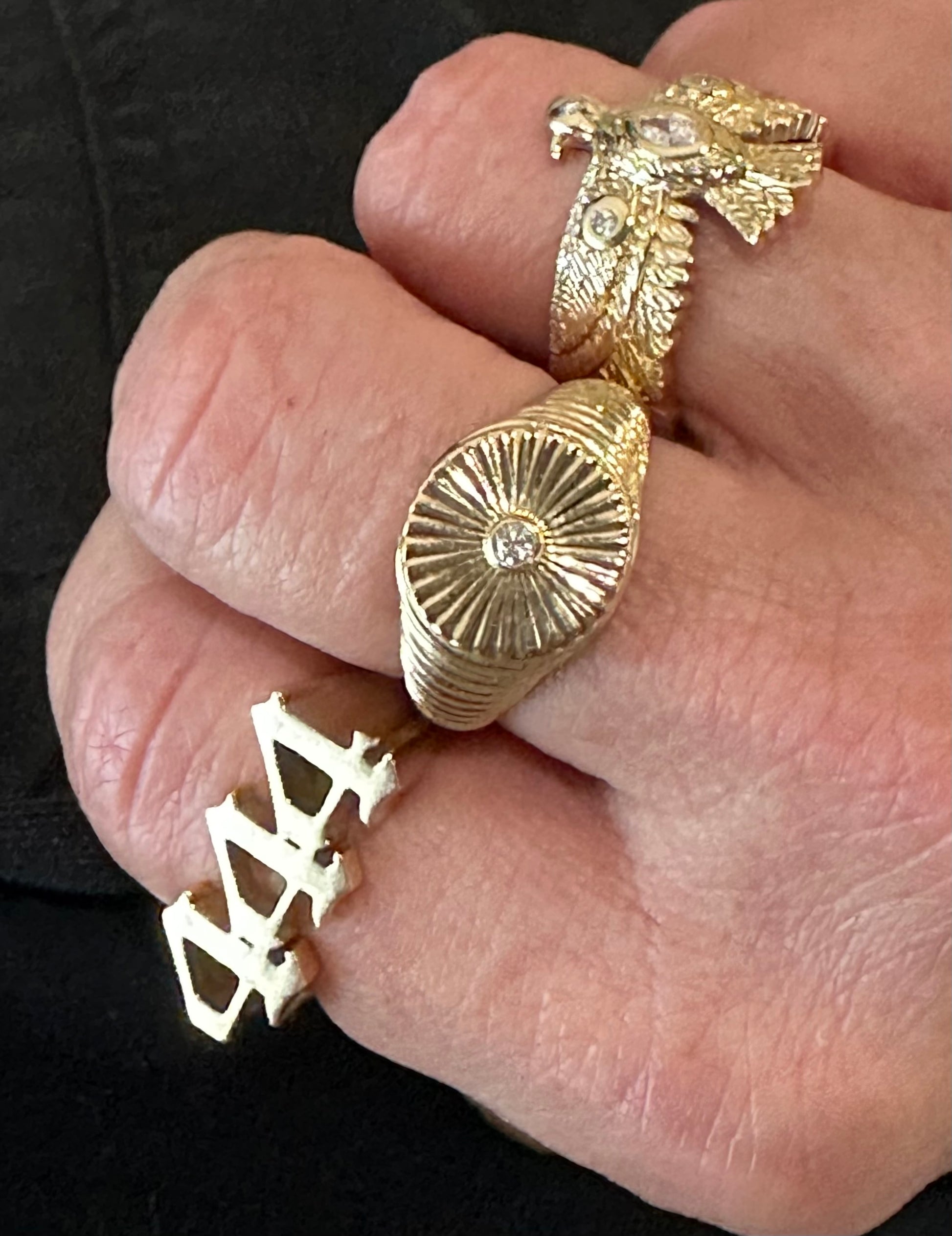 A beautiful round signet ring with fluted details. Crafted in 14k yellow gold and features a sparkling diamond in the center.
