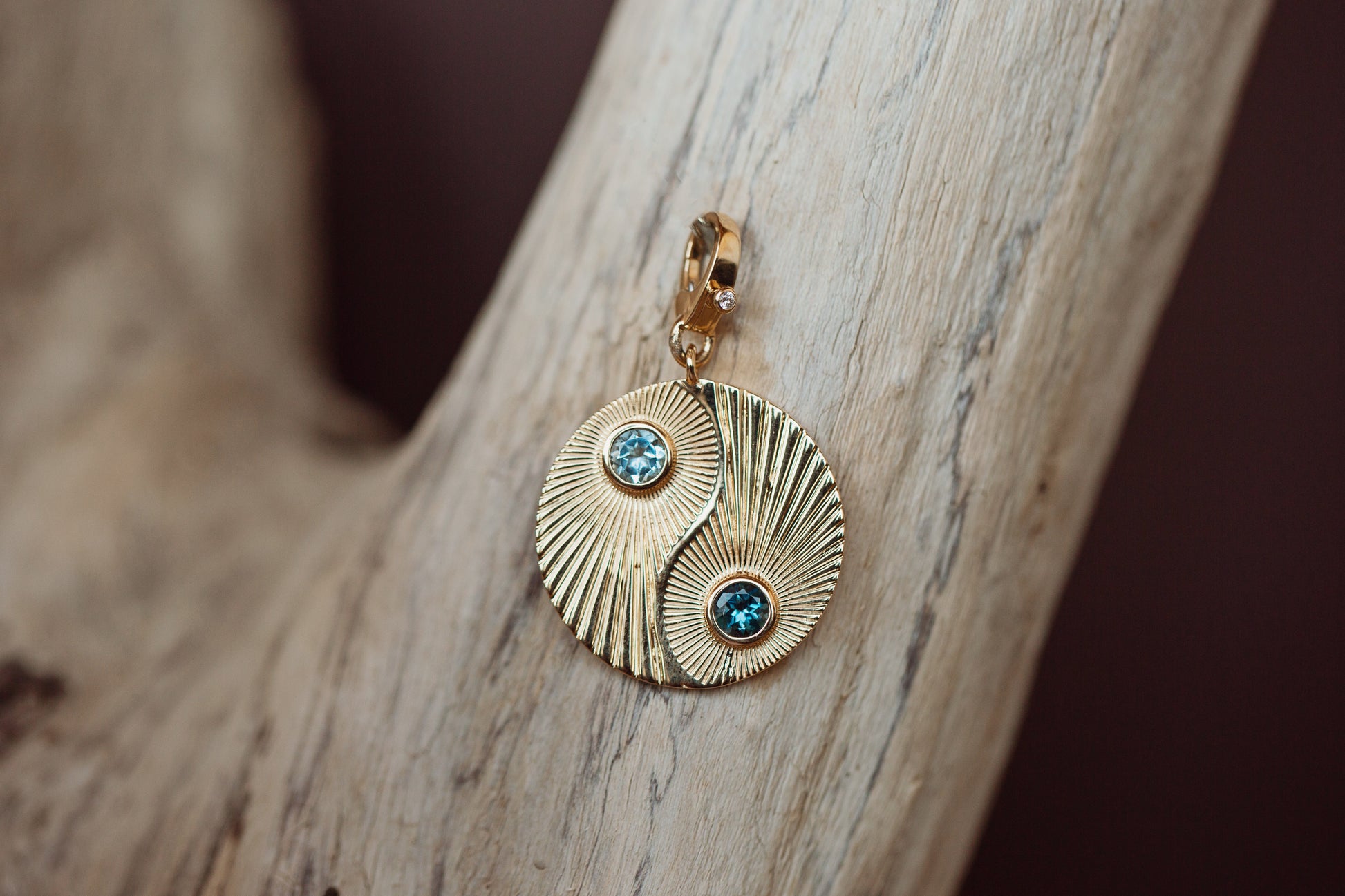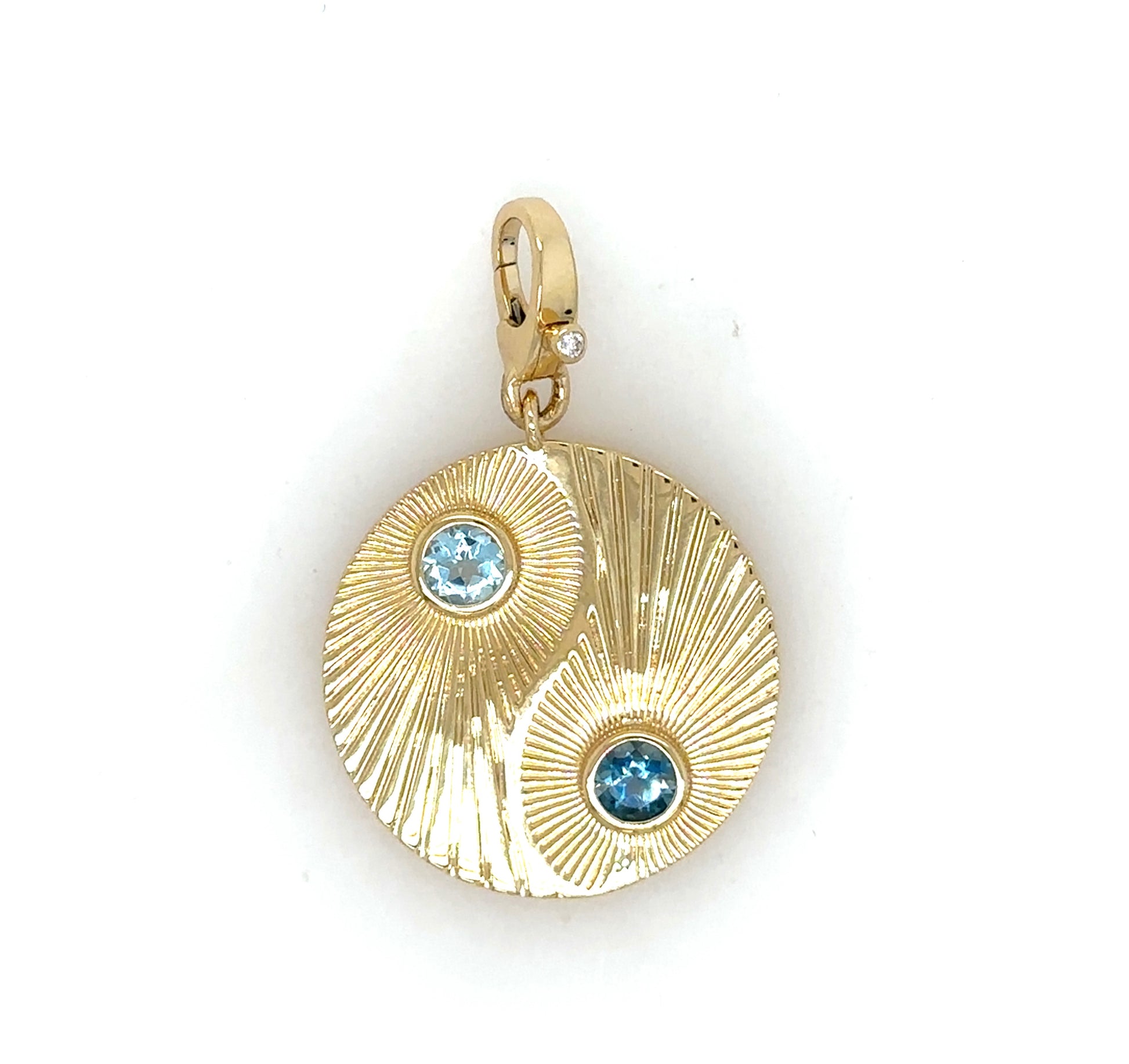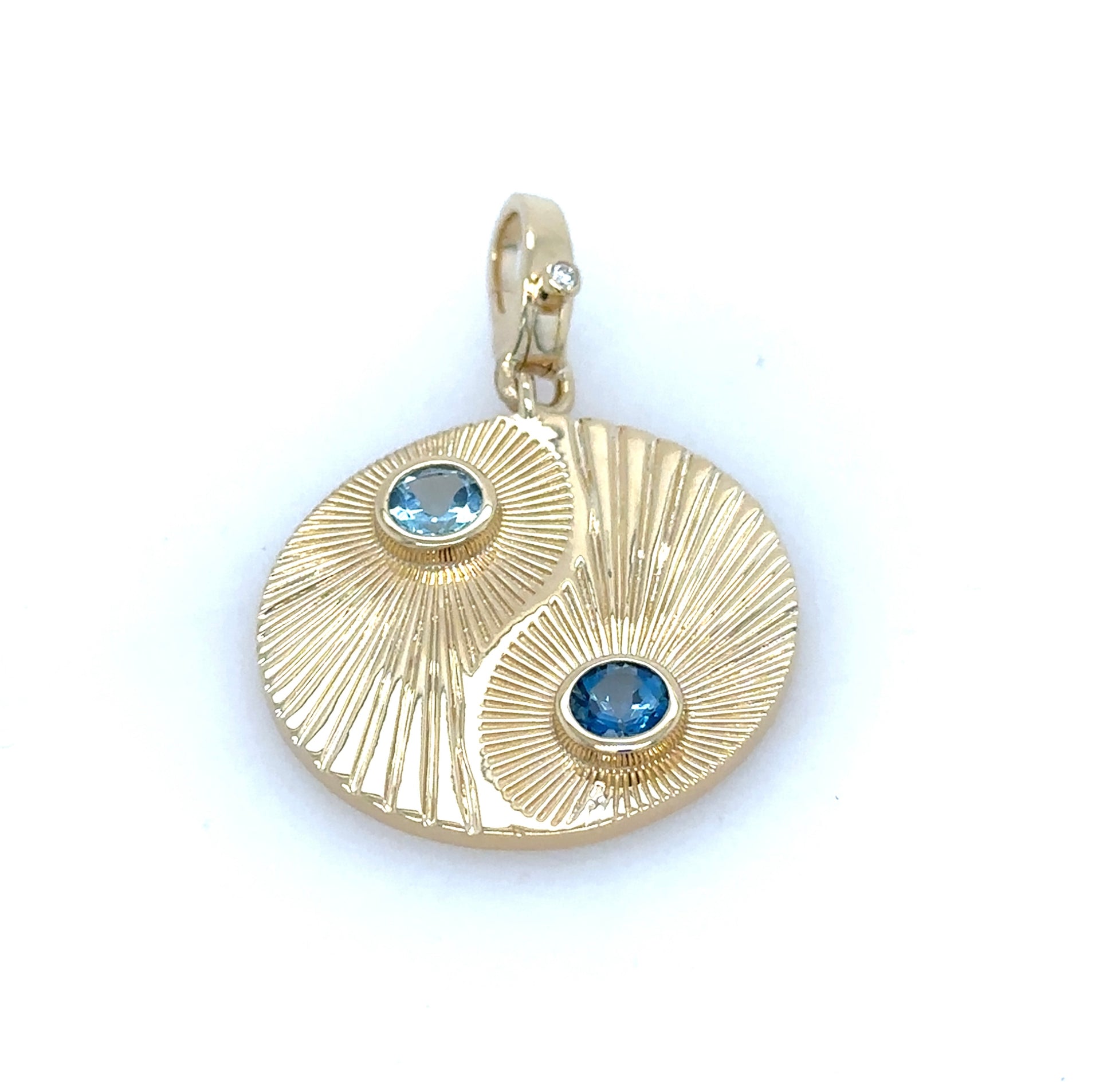 Find balance and harmony with our Fluted Ying Yang Enhancer Pendant. Made with 14k yellow gold, this beautiful pendant features a unique fluted design and sparkling sky blue and London blue topaz gemstones. Wear it as a reminder to stay centered and in tune with yourself. Necklace sold separately.