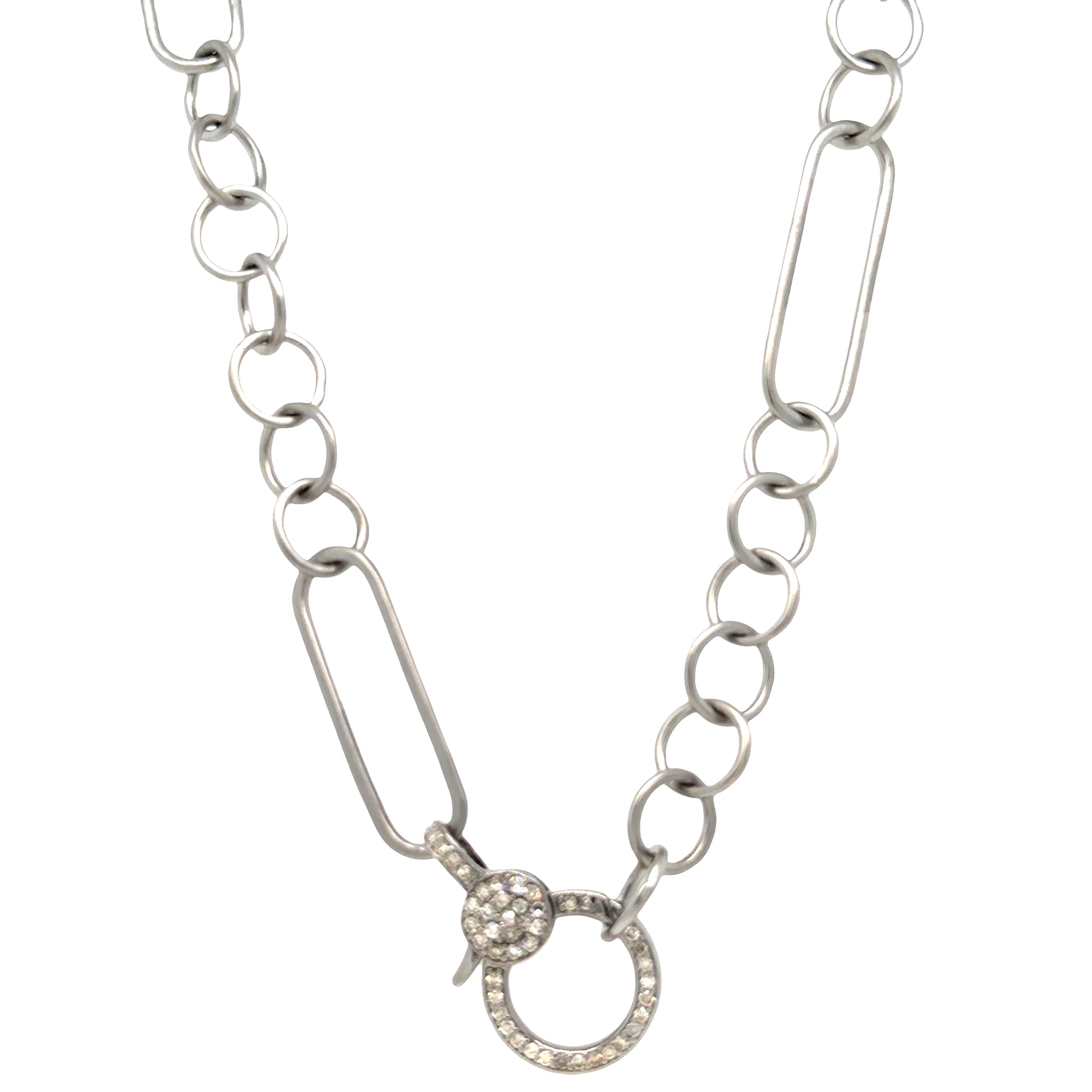 Elevate your everyday with this modern-meets-classic sterling silver chain. Featuring a mix of bold elongated and round links, it brings effortless edge and versatility to any look. A diamond-pavé clasp — adds a touch of refined sparkle while serving as both closure and centerpiece.