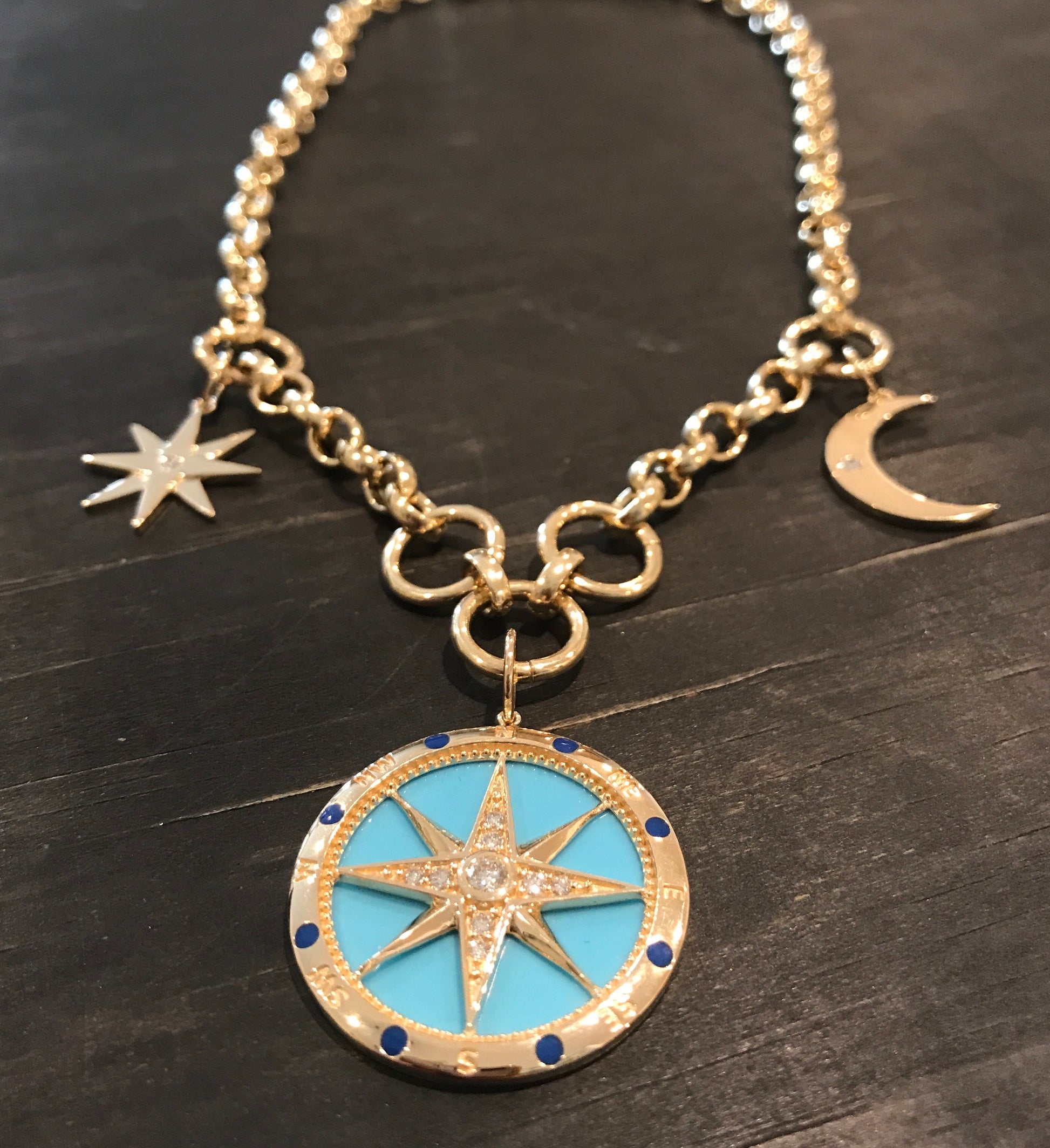 This stunning statement piece is available in your choice of lapis, malachite, turquoise, or mother-of-pearl with diamond accents in 14K yellow gold.