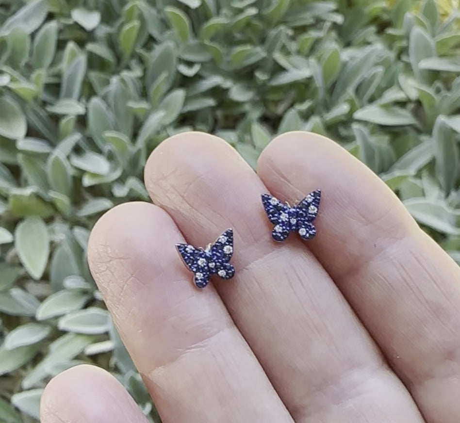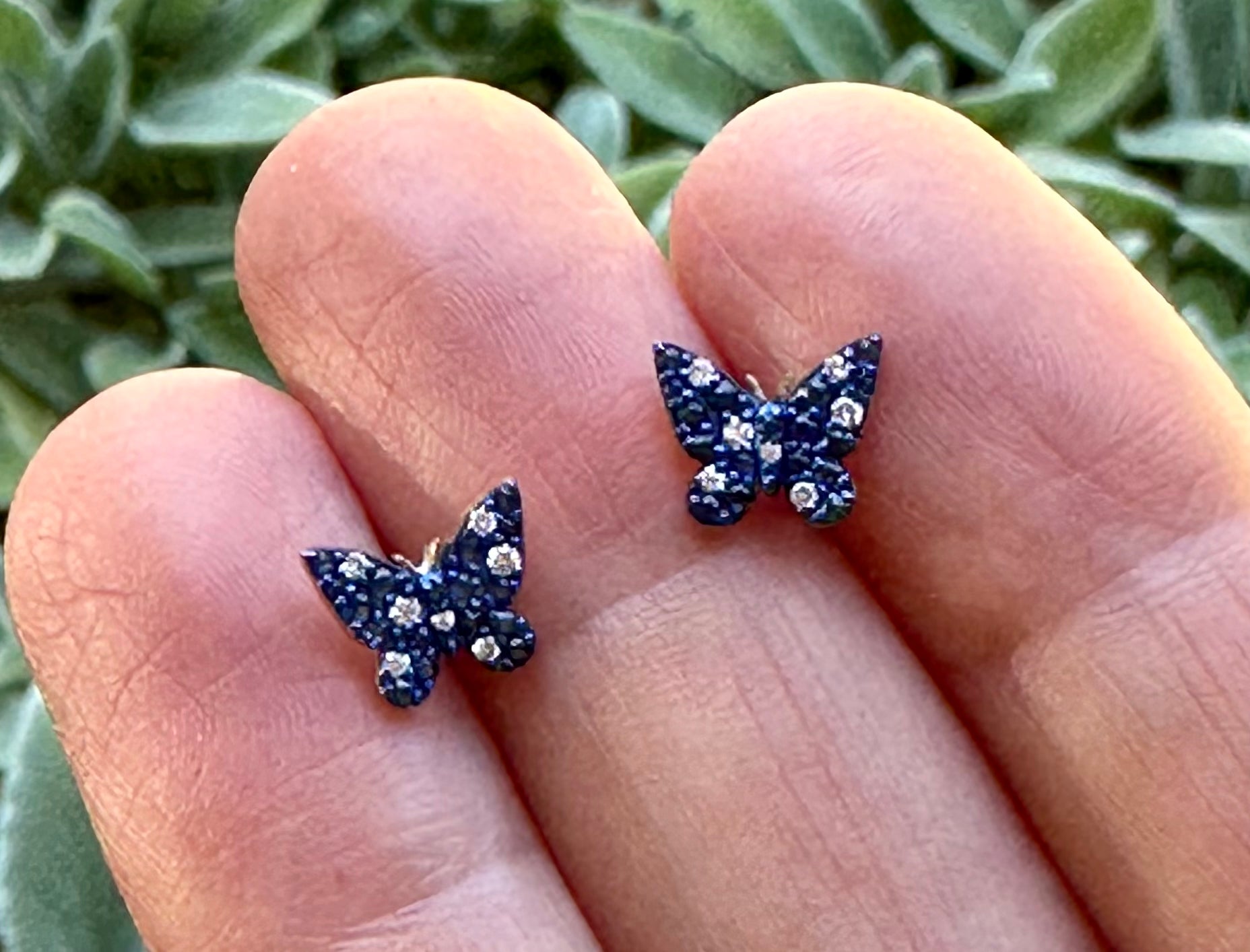 Our Olina gold and gemstone stud earrings are available in blue sapphires or black diamonds. The butterfly is a symbol for new beginnings and transformation. A great everyday earring.