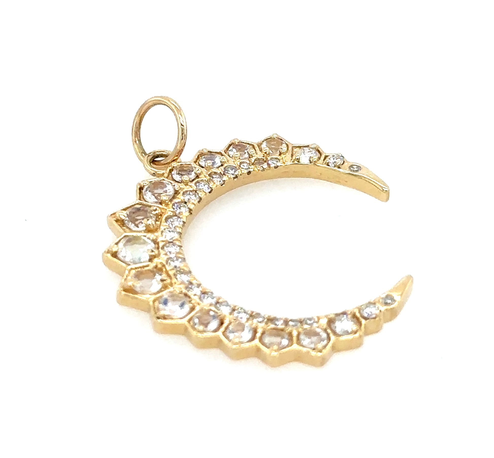 Rainbow Moonstone & Diamonds Crescent Moon Pendant