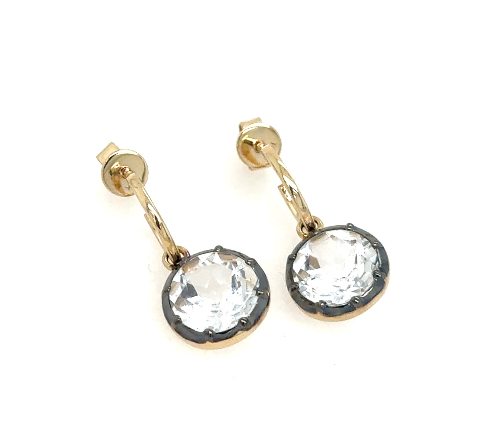 These elegant White Topaz Rhodium Framed drop earrings are designed in 14k yellow gold. Beautiful white topaz stones framed in rhodium, creating a stunning pair of earrings that are perfect for both formal and casual occasions. Dress it up with a little black dress or elevate your everyday look with jeans and a t-shirt.