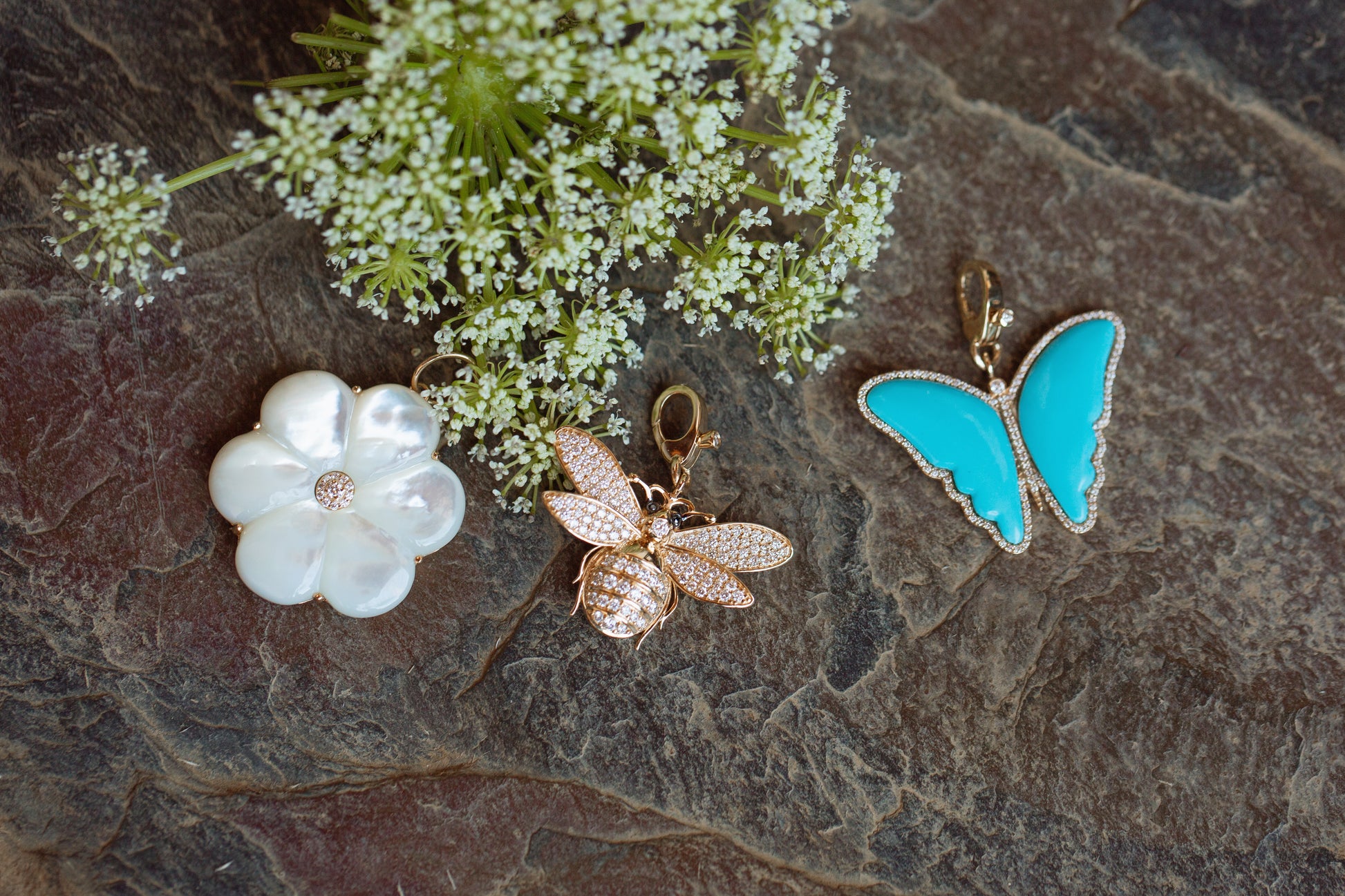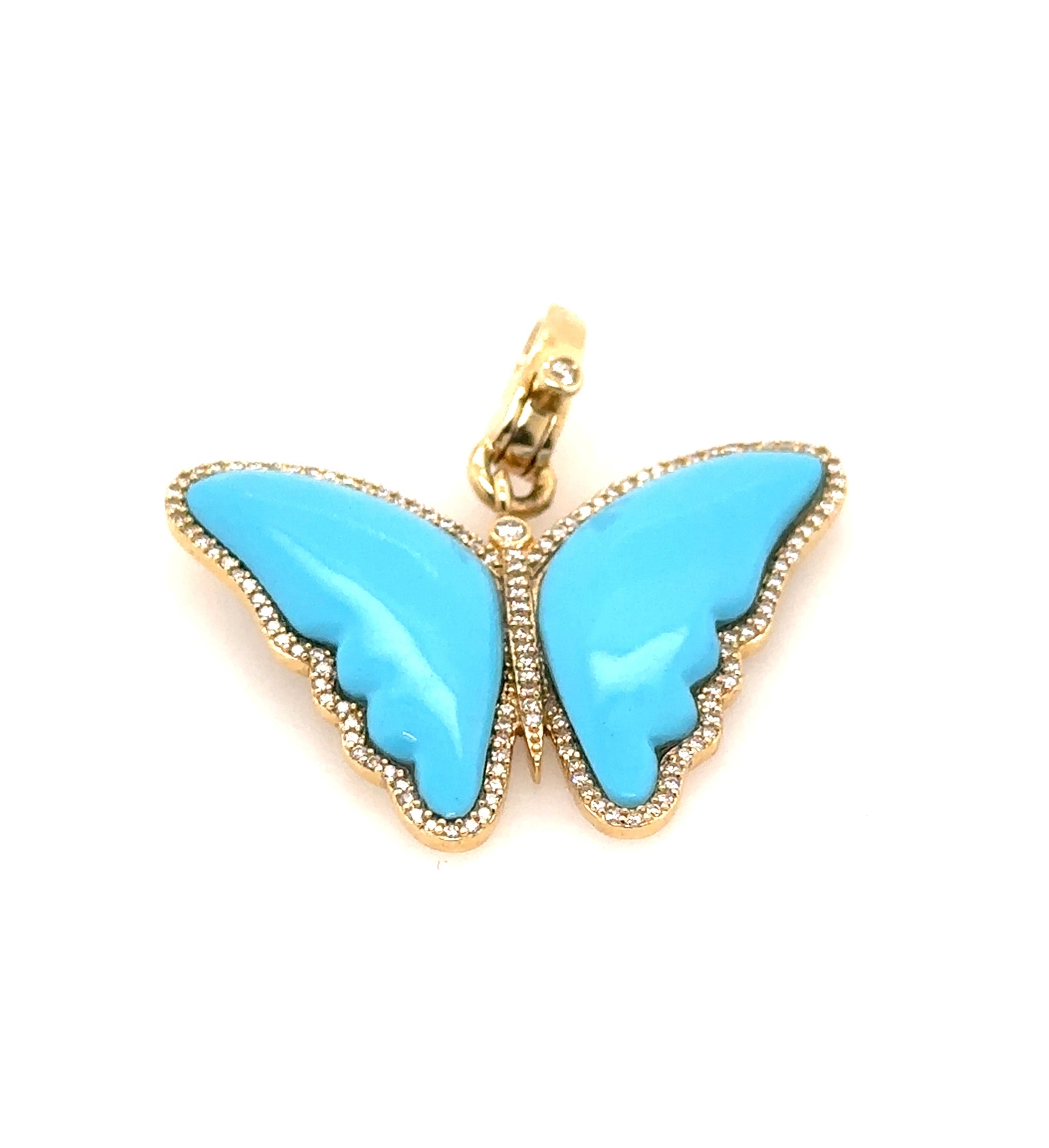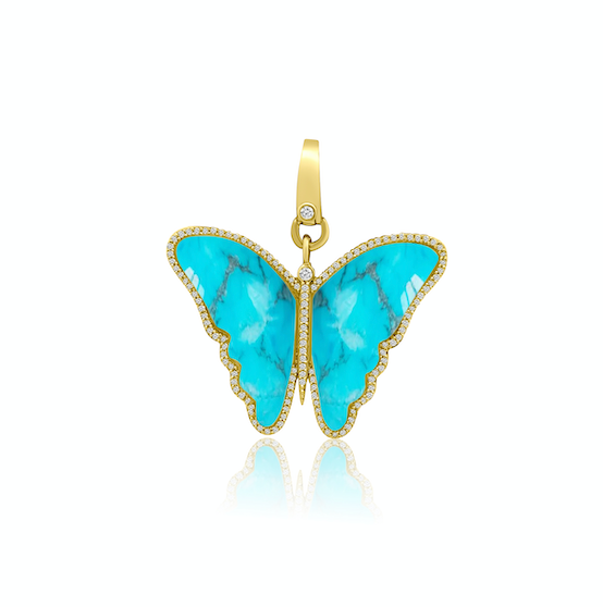 Transform your look with our Sawyer Turquoise & Diamond Butterfly Pendant. Designed in 14k yellow gold with a dazzling diamond border, this pendant is a show stopper. Perfect for dressing up or down, it's a playful and elegant symbol of new beginnings.